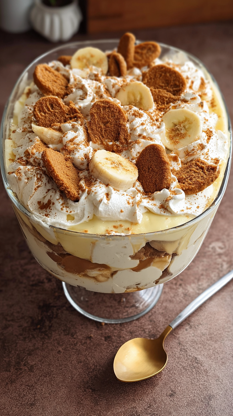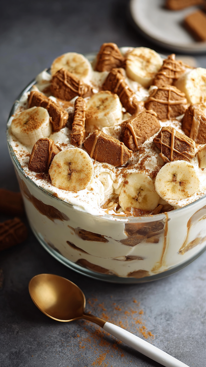 A inspiração desta receita vem do clássico banana pudding, sobremesa tradicional dos Estados Unidos, especialmente popular no sul do país. O banana pudding é feito com camadas de creme de baunilha, bananas fatiadas e bolachas tipo wafer. Com o tempo, a receita ganhou versões modernas e mais elaboradas, como esta que substitui os wafers pelos deliciosos biscoitos Biscoff – conhecidos pelo seu sabor caramelizado com toque de canela.